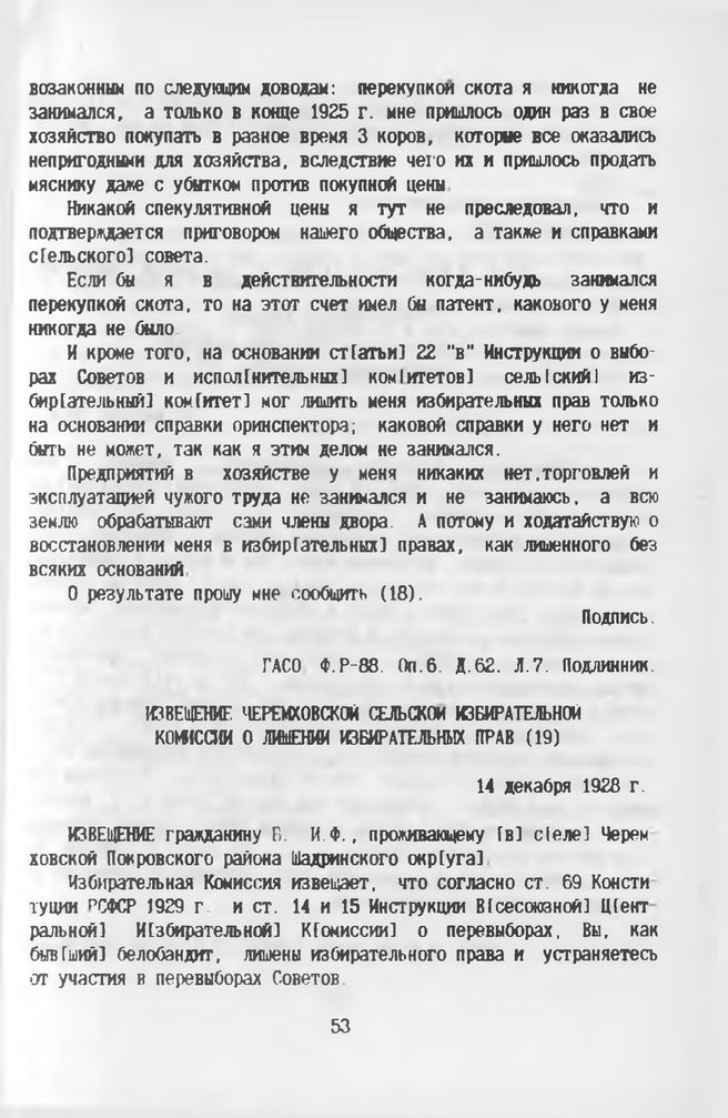 Извещение Черемховской сельской избирательной комиссии о лишении избирательных прав. 14 декабря 1928 г.