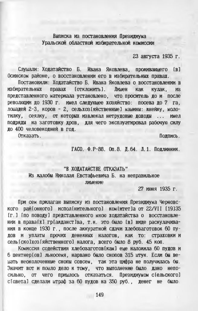 Выписка из постановления Президиума Уральской областной избирательной комиссии. 23 августа 1935 г.