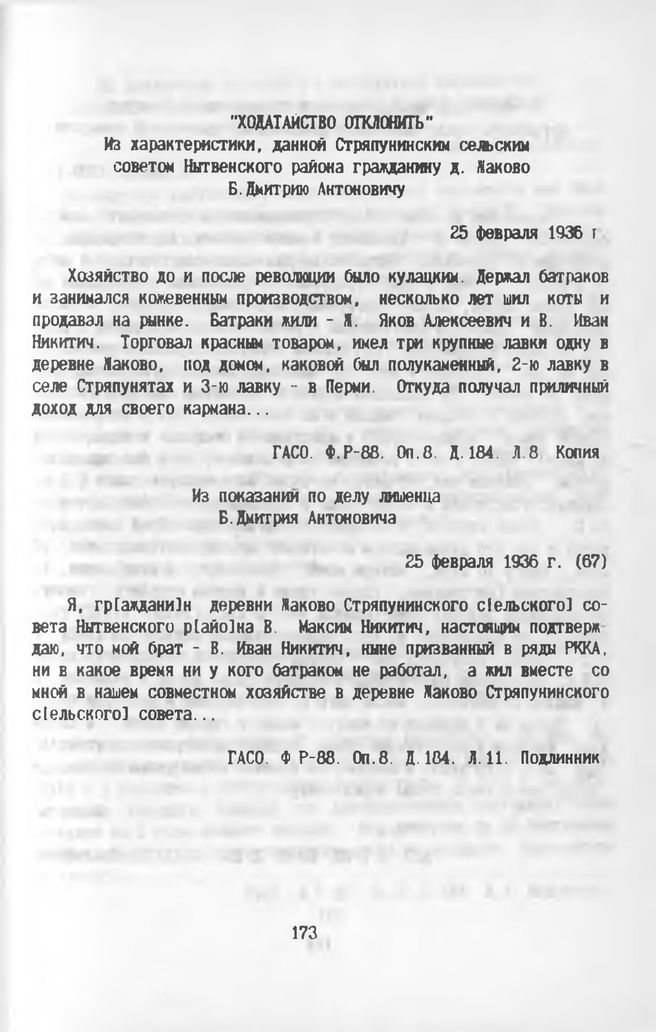 «Ходатайство отклонить». Из характеристики, данной Стряпунинским сельским советом Нытвенского района гражданину д. Жаково Б. Дмитрию Антоновичу. 25 февраля 1936 г.
