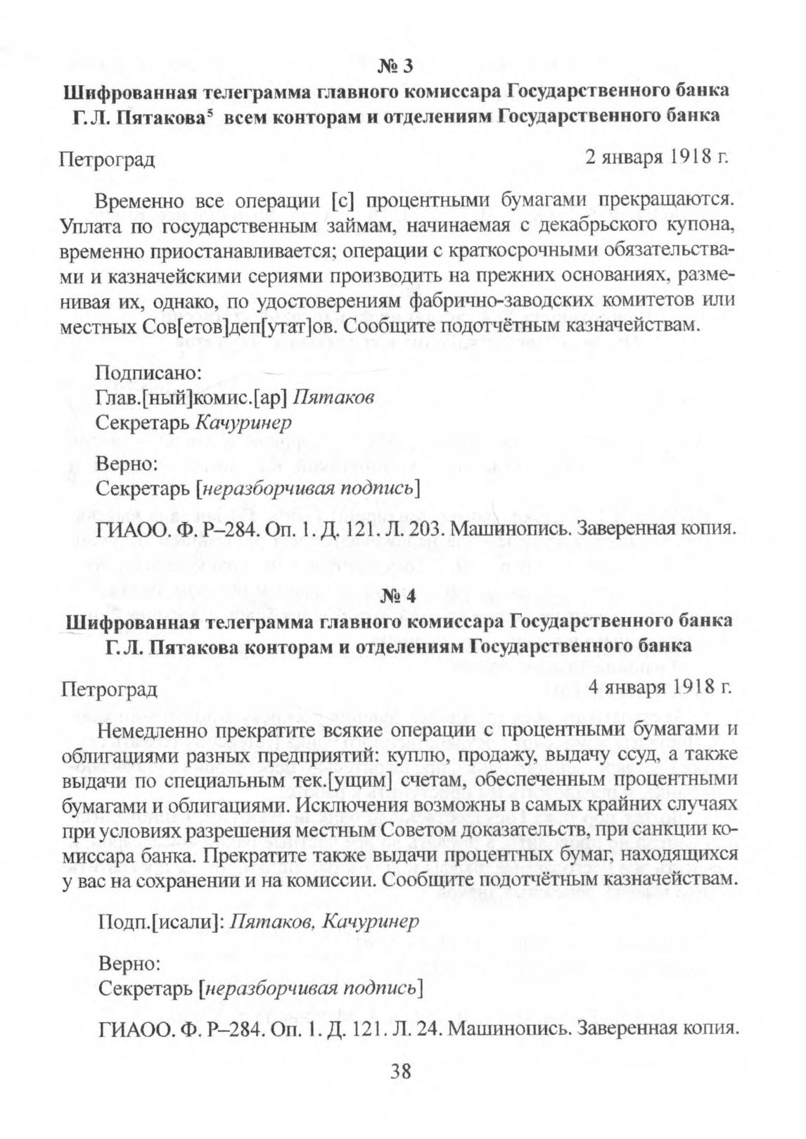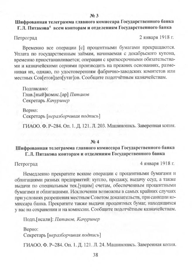 Шифрованная телеграмма главного комиссара Государственного банка Г.Л. Пятакова всем конторам и отделениям Государственного банка. Петроград. 2 января 1918 г. // ГИАОО. Ф. P-284. Oп. 1. Д. 121. Л. 203. Машинопись. Заверенная копия.