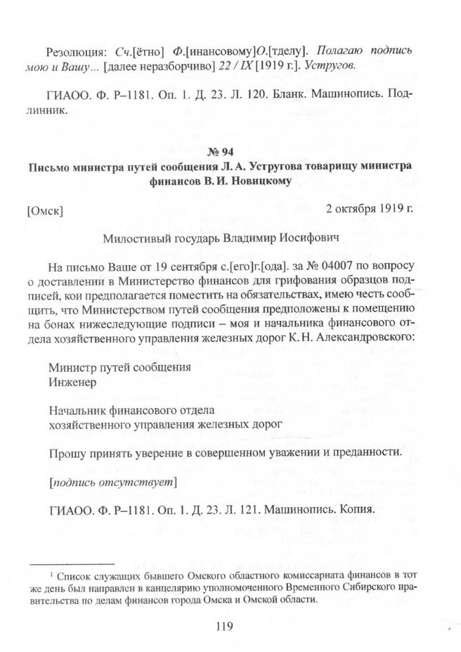 Письмо министра путей сообщения Л.А. Устругова товарищу министра финансов В.И. Новицкому. [Омск]. 2 октября 1919 г. // ГИАОО. Ф. P-1181. Oп. 1. Д. 23. Л. 121. Машинопись. Копия.