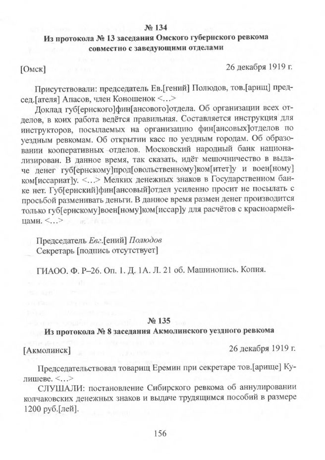 Из протокола № 8 заседания Акмолинского уездного ревкома. [Акмолинск]. 26 декабря 1919 г. // ГИАОО. Ф. P-26. Oп. 1. Д. 205. Л. 15 об. Машинопись. Заверенная копия.