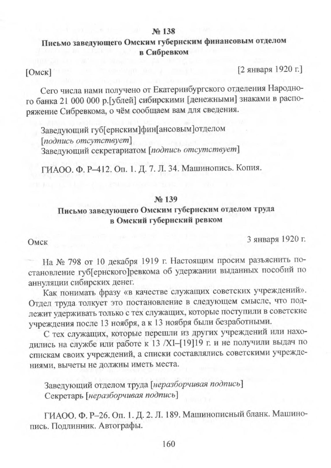 Письмо заведующего Омским губернским финансовым отделом в Сибревком. [Омск]. [2 января 1920 г.] // ГИАОО. Ф. Р—412. Oп. 1. Д. 7. Л. 34. Машинопись. Копия.