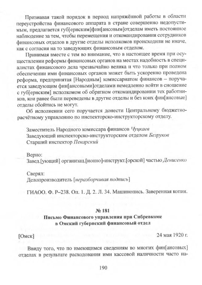 Письмо Финансового управления при Сибревкоме в Омский губернский финансовый отдел. [Омск]. 24 мая 1920 г. // ГИАОО. Ф. P-238. Oп. 1. Д. 7. Л. 242-242 об. Машинопись. Подлинник.