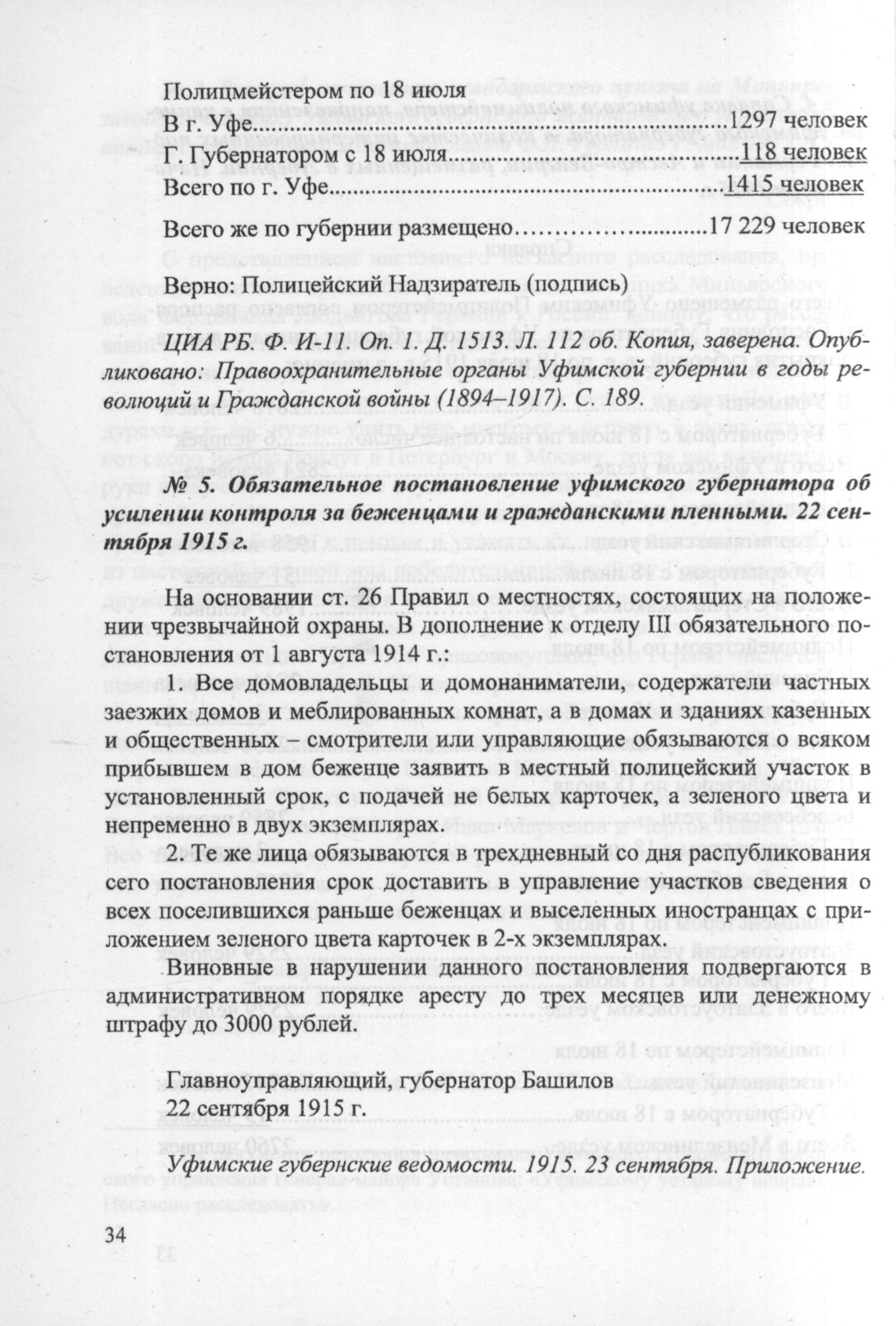 Обязательное постановление уфимского губернатора об усилении контроля за беженцами и гражданскими пленными. 22 сентября 1915 г. // Уфимские губернские ведомости. 1915. 23 сентября. Приложение.