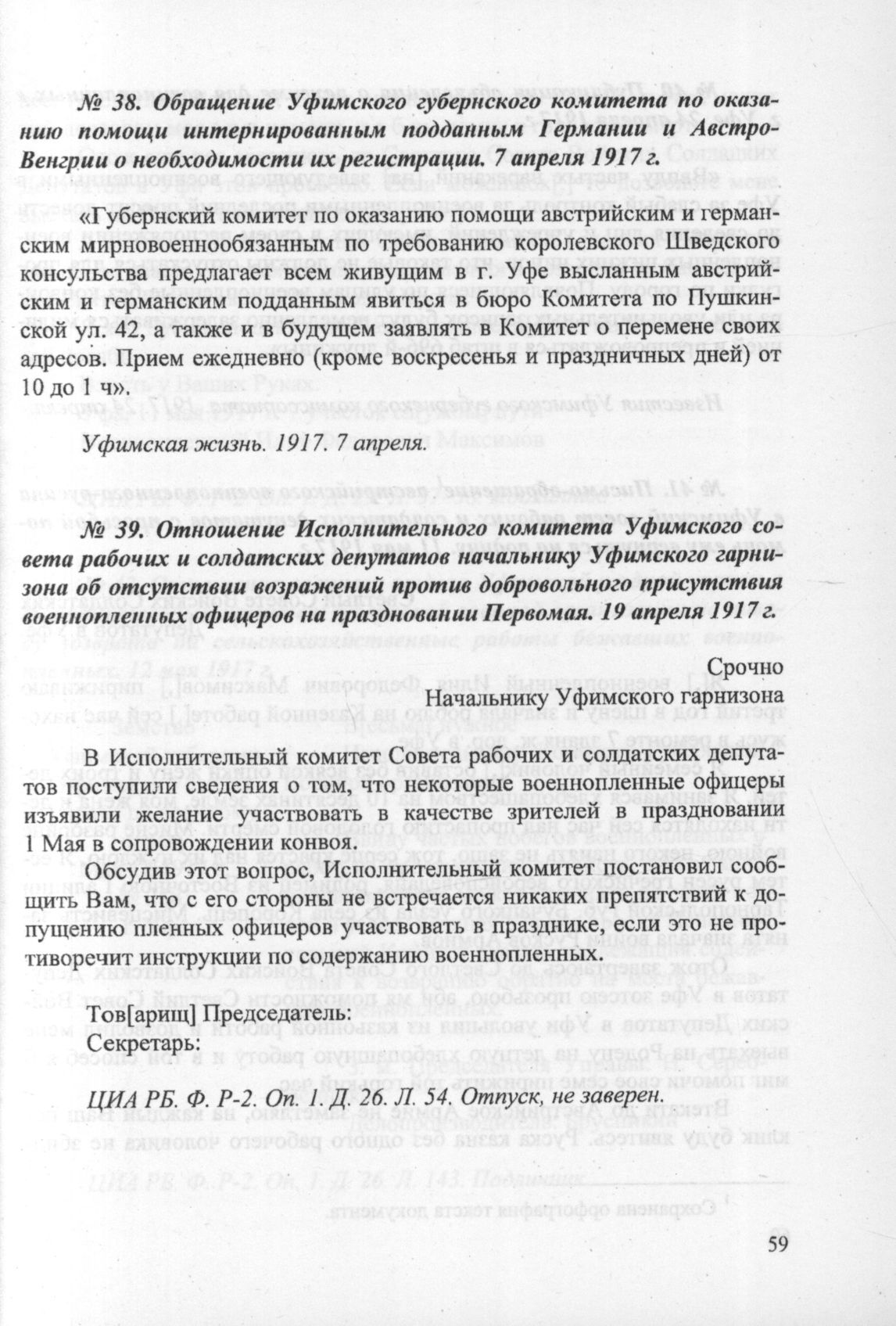 Отношение Исполнительного комитета Уфимского совета рабочих и солдатских депутатов начальнику Уфимского гарнизона об отсутствии возражений против добровольного присутствия военнопленных офицеров на праздновании Первомая. 19 апреля 1917 г. // ЦИА РБ. Ф. P-2. Oп. 1. Д. 26. Л. 54. Отпуск, не заверен.