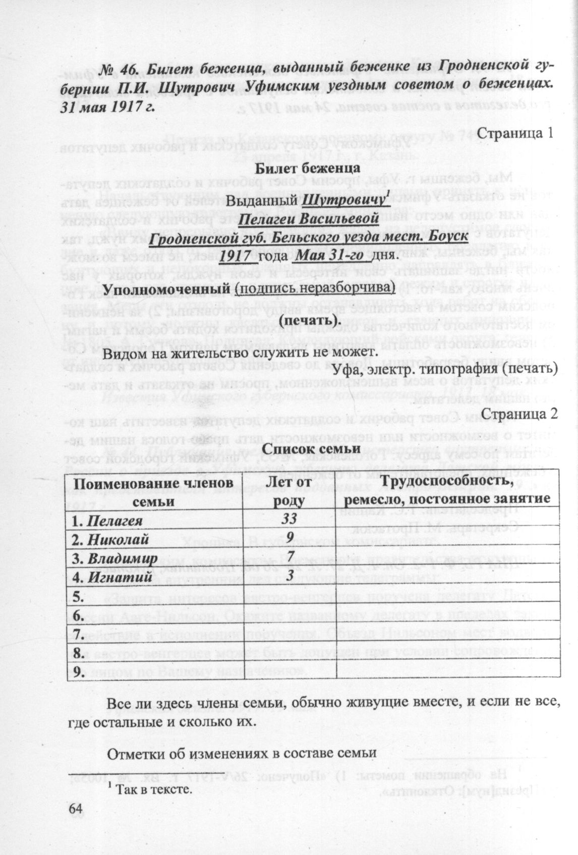 Билет беженца, выданный беженке из Гродненской губернии И.И. Шутрович Уфимским уездным советом о беженцах. 31 мая 1917 г. // ЦИА РБ. Ф. P-1694. Oп. 1. Д. 13. Л. 161-164. Подлинник.
