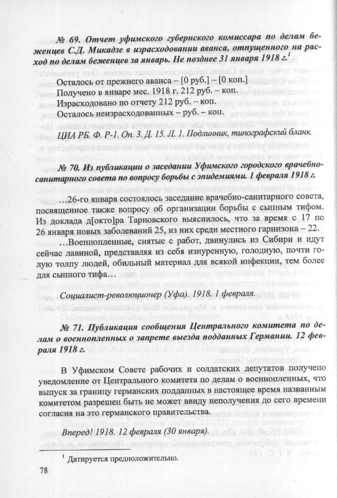 Отчет уфимского губернского комиссара по делам беженцев С.Д. Микадзе в израсходовании аванса, отпущенного на расход по делам беженцев за январь. Не позднее 31 января 1918 г. // ЦИА РБ. Ф. Р-1. Oп. 3. Д. 15. Л. 1. Подлинник, типографский бланк.