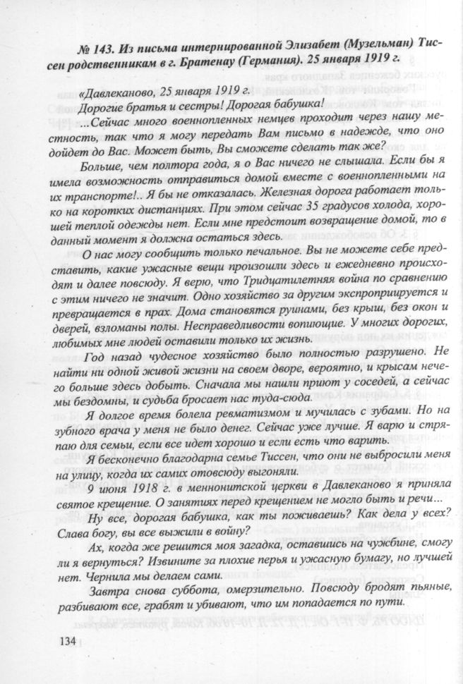 Из письма интернированной Элизабет (Музельман) Тиссен родственникам в г. Братенау (Германия). 25 января 1919 г. // Цит. по: Хофман-Хеге Ш. Все может выдержать сердце. Долгие жизненные дороги Элизабет Тиссен / пер. с нем. Г.П. Лисенкова, обработка А. А. Казанцева. Heilbronn Eugen Salzer. Verlag, 1997. С. 22.