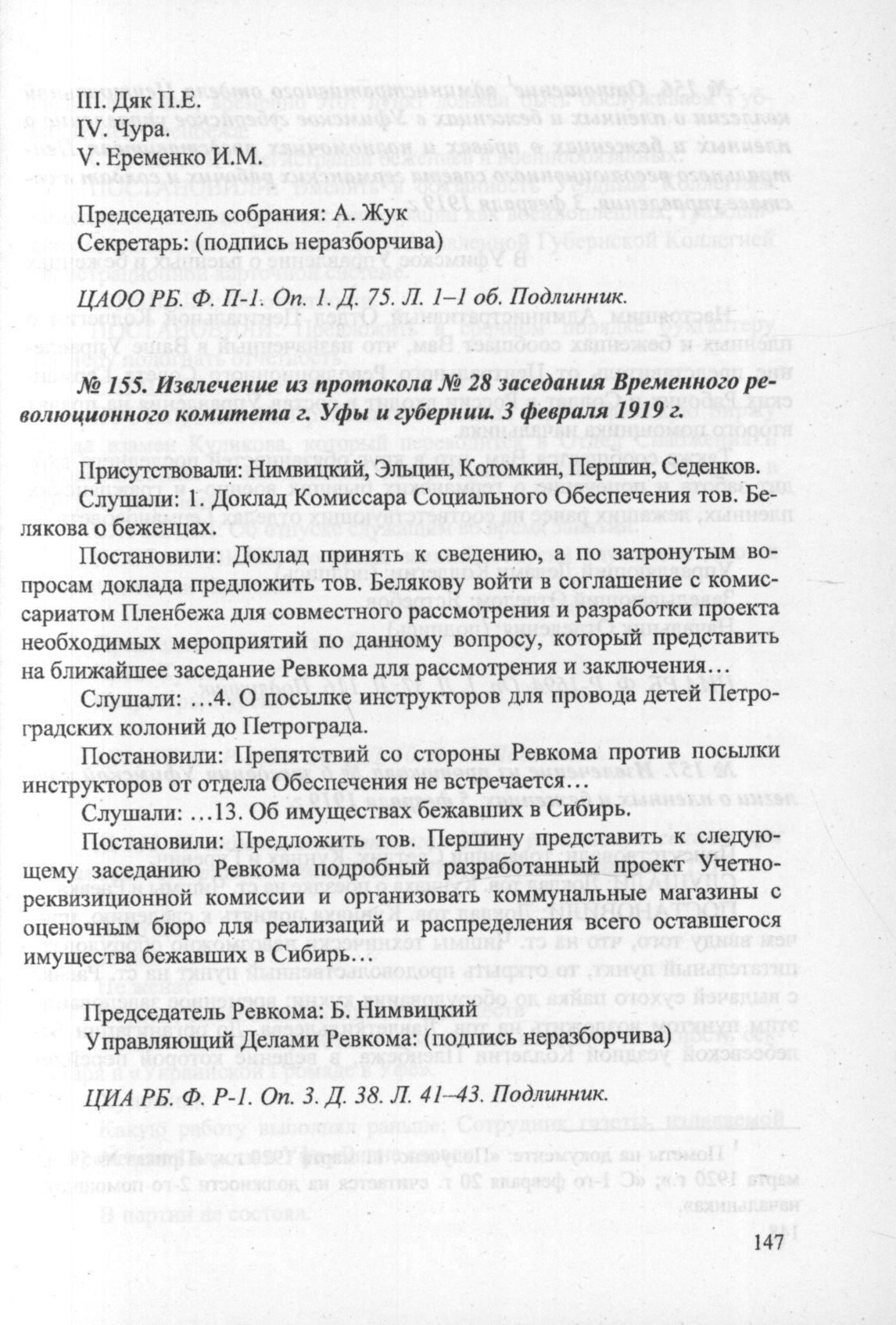 Извлечение из протокола № 28 заседания Временного революционного комитета г. Уфы и губернии. 3 февраля 1919 г. // ЦИА РБ. Ф. P-1. Oп. 3. Д. 38. Л. 41-43. Подлинник.