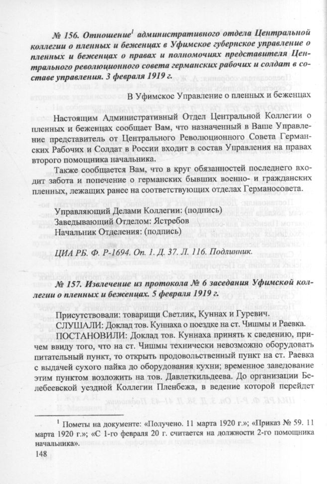 Отношение административного отдела Центральной коллегии о пленных и беженцах в Уфимское губернское управление о пленных и беженцах о правах и полномочиях представителя Центрального революционного совета германских рабочих и солдат в составе управления. 3 февраля 1919 г. // ЦИА РБ. Ф. P-1694. Oп. 1. Д. 37. Л. 116. Подлинник.