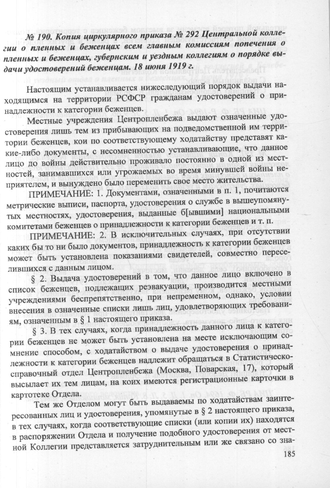 Копия циркулярного приказа № 292 Центральной коллегии о пленных и беженцах всем главным комиссиям попечения о пленных и беженцах, губернским и уездным коллегиям о порядке выдачи удостоверений беженцам. 18 июня 1919 г. // ЦИА РБ. Ф. P-1694. Oп. 1. Д. 5. Л. 9 об. Копия, машинопись, заверена.