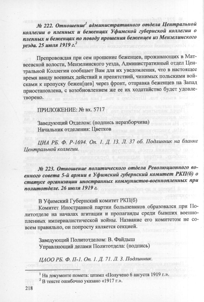Отношение административного отдела Центральной коллегии о пленных и беженцах Уфимской губернской коллегии о пленных и беженцах по поводу прошения беженцев из Мензелинского уезда. 25 июля 1919 г. // ЦИА РБ. Ф. P-1694. Oп. 1. Д. 13. Л. 37 об. Подлинник на бланке Центральной коллегии.