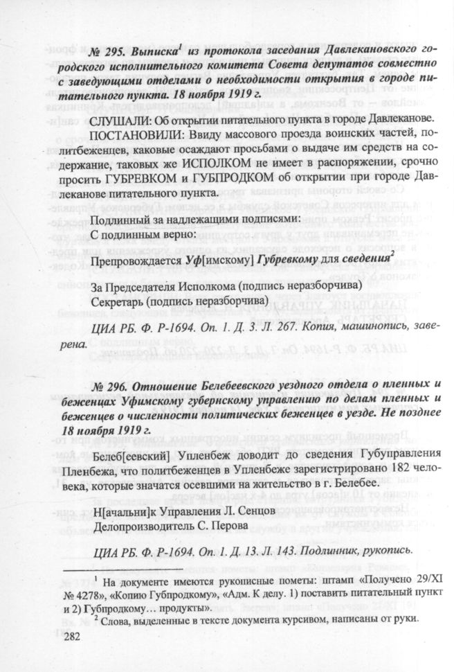 Выписка из протокола заседания Давлекановского городского исполнительного комитета Совета депутатов совместно с заведующими отделами о необходимости открытия в городе питательного пункта. 18 ноября 1919 г. // ЦИА РБ. Ф. P-1694. Oп. 1. Д. 3. Л. 267. Копия, машинопись, заверена.