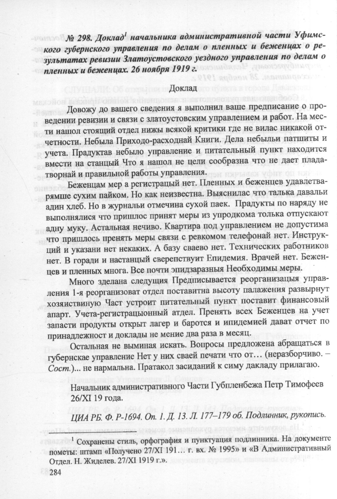 Доклад начальника административной части Уфимского губернского управления по делам о пленных и беженцах о результатах ревизии Златоустовского уездного управления по делам о пленных и беженцах. 26 ноября 1919 г. // ЦИА РБ. Ф. P-1694. Oп. 1. Д. 13. Л. 177-179 об. Подлинник, рукопись.