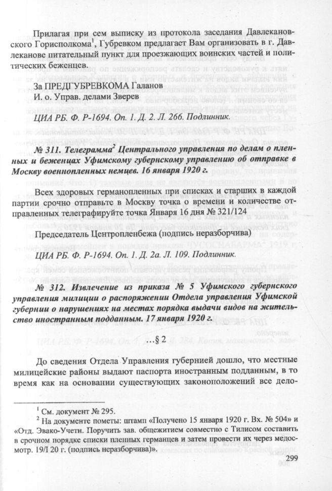 Извлечение из приказа № 5 Уфимского губернского управления милиции о распоряжении Отдела управления Уфимской губернии о нарушениях на местах порядка выдачи видов на жительство иностранным подданным. 17 января 1920 г. // ЦИА РБ. Ф. P-1262. Oп. 1. Д. 71а. Л. 50. Копия, машинопись, не заверена. Опубликовано: Правоохранительные органы Уфимской губернии в годы революций и Гражданской войны : сборник документов и материалов. — Уфа : Академия ВЭГУ, 2007. Ч. 2. С. 25.