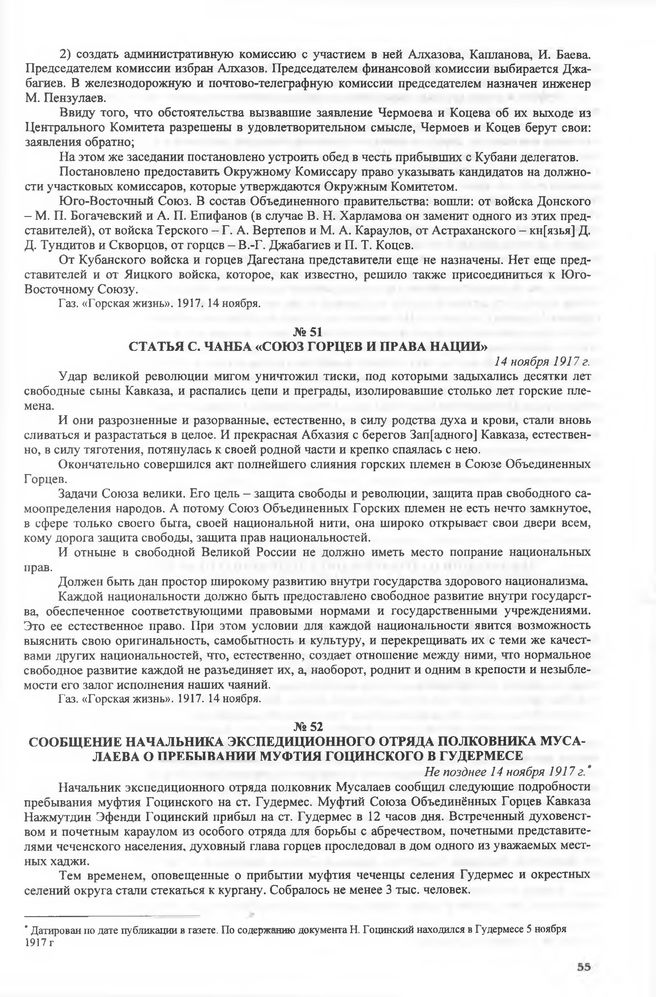 Союз горцев и права наций. Статья С. Чанба в газете «Горская жизнь». 14 ноября 1917 года // Газ. «Горская жизнь». 1917. 14 ноября.