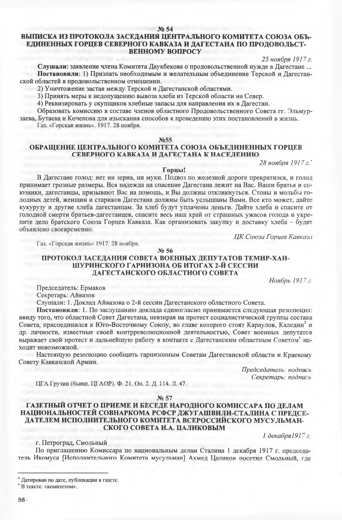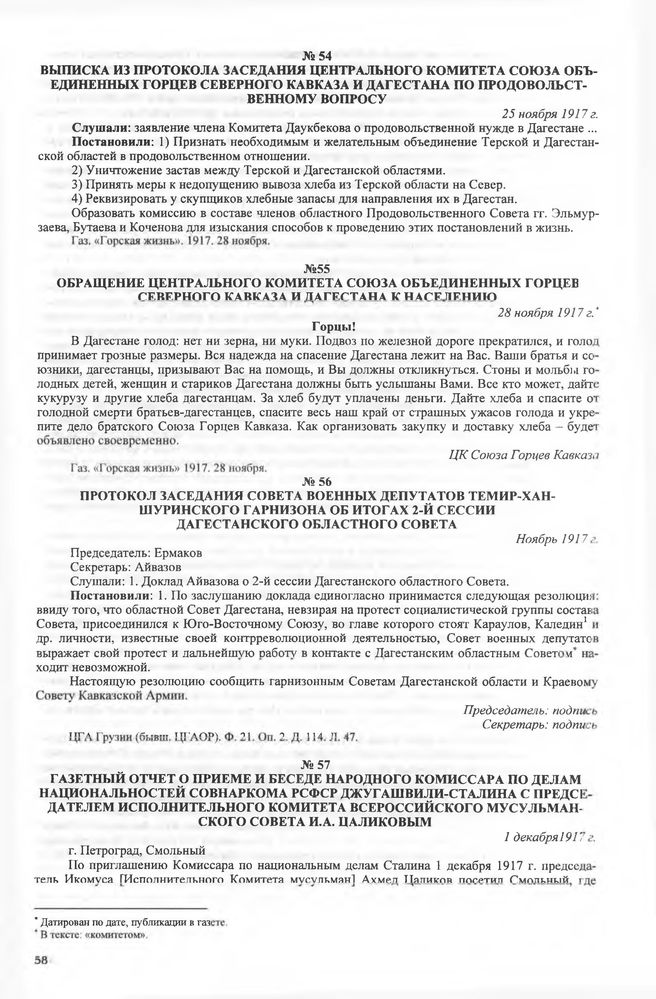 Газетный отчет о приеме Народного Комиссара по делам национальностей Совнаркома РСФСР Джугашвили-Сталина с председателем Икомус (Исполнительного Комитета Всероссийского мусульманского Совета) Ахмедом Цаликовым. 1 декабря 1917 года // Газ. «Горская жизнь». 1917. 22 декабря. № 50.