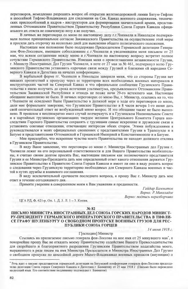 Письмо министра иностранных дел Союза горских народов министру-резиденту Германского императорского правительства в Тифлисе графу Шуленбургу о свободном пропуске военных грузов для республики Союза горцев. 14 июня 1918 года // ЦГА СО-А. Ф. Р-9. Оп. 1. Д. 7. Л. 13, 16.