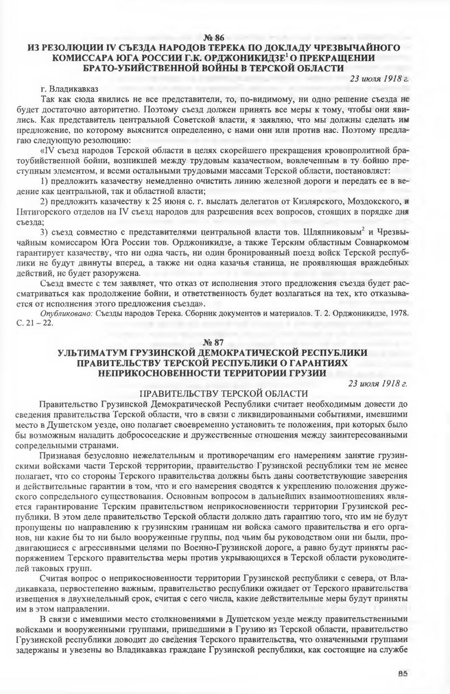 Из резолюции IV съезда народов Терека по докладу Чрезвычайного Комиссара Юга России Г.К. Орджоникидзе о прекращении братоубийственной войны в Терской области. 23 июля 1918 года // Съезды народов Терека. Сборник документов и материалов. Т. 2. Орджоникидзе, 1978. С. 21-22.