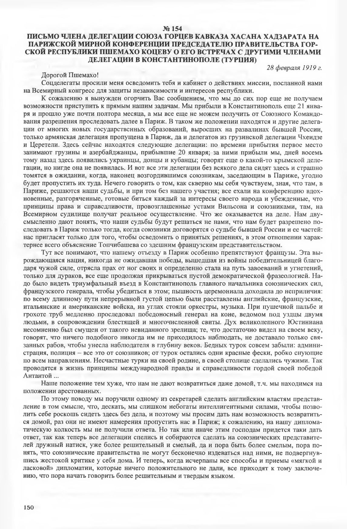 Письмо члена делегации Союза горцев Кавказа Хасана Хадзарата на Парижской мирной конференции председателю Правительства Горской Республики Пшемаху Коцеву о его встречах с другими членами делегации в Константинополе. 28 февраля 1919 года