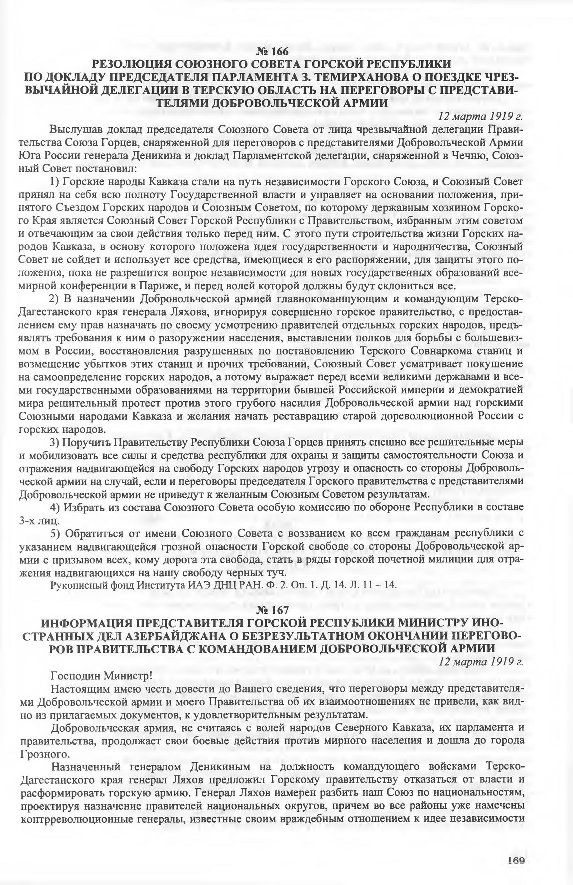 Резолюция Союзного Совета Горской Республики по докладу председателя парламента 3. Темирханова о поездке Чрезвычайной делегации в Терскую область на переговоры с представителями Добровольческой армии. 12 марта 1919 года