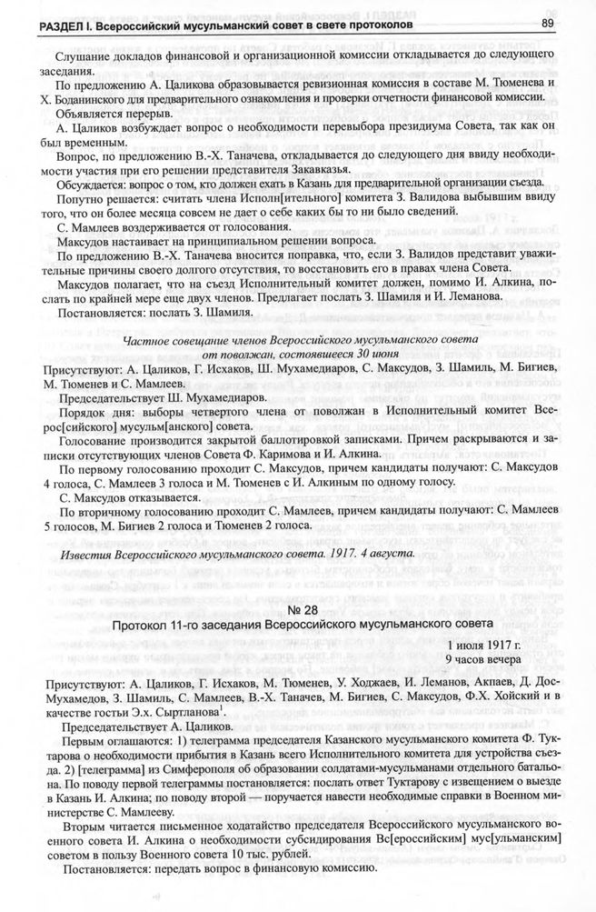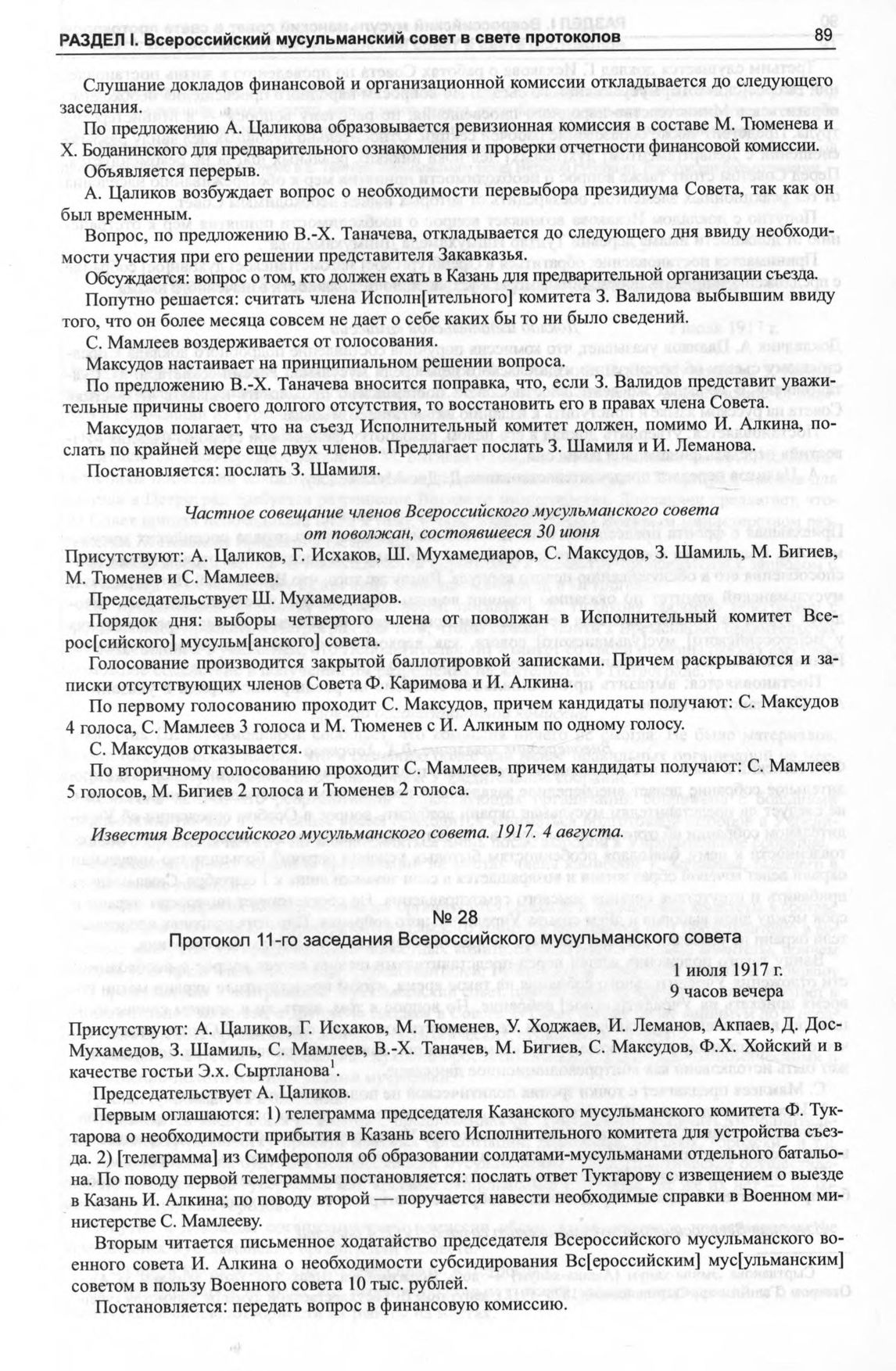 Протокол 11-го заседания Всероссийского мусульманского совета. 1 июля 1917 г. // Известия Всероссийского мусульманского совета. 1917. 4 августа.