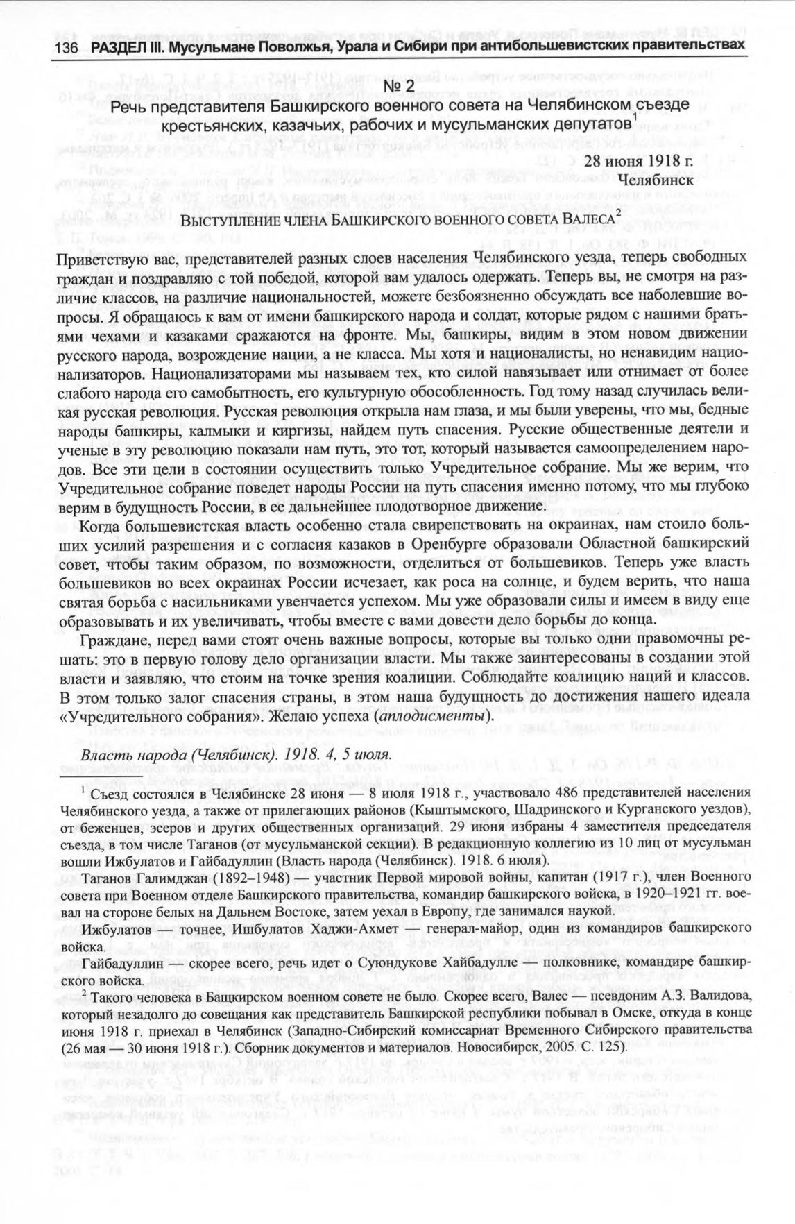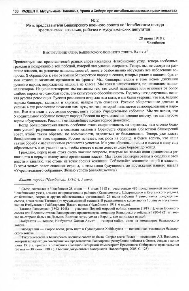 Речь представителя Башкирского военного совета на Челябинском съезде крестьянских, казачьих, рабочих и мусульманских депутатов. 28 июня 1918 г. // Власть народа (Челябинск). 1918. 4, 5 июля.