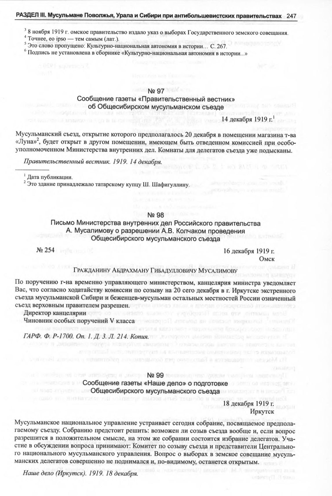 Письмо Министерства внутренних дел Российского правительства А. Мусалимову о разрешении А.В. Колчаком проведения Общесибирского мусульманского съезда. 16 декабря 1919 г. // ГА РФ. Ф. P-1700. Oп. 1. Д. 3. Л. 214. Копия.