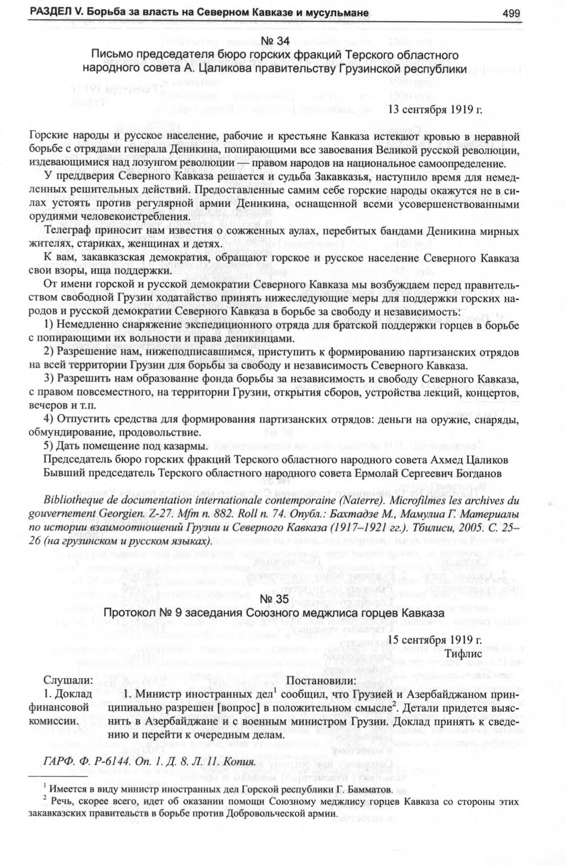 Письмо председателя бюро горских фракций Терского областного народного совета А. Цаликова правительству Грузинской республики. 13 сентября 1919 г. // Bibliotheque de documentation Internationale contemporaine (Naterre). Microfilmes les archives du gouvernement Georgien. Z-27. Mfm n. 882. Roll n. 74.; Бахтадзе M., Мамулиа Г. Материалы по истории взаимоотношений Грузии и Северного Кавказа (1917-1921 гг.). Тбилиси, 2005. С. 25- 26 (на грузинском и русском языках).