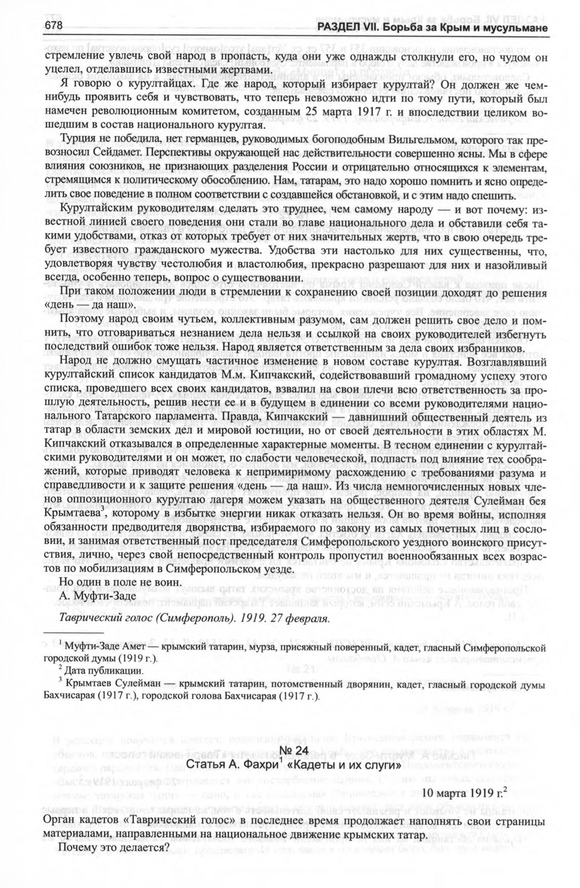 Статья А. Фахри «Кадеты и их слуги». 10 марта 1919 г. // РГАСПИ. Ф. 71. Oп. 33. Д. 1530. Л. 8. Заверенный перевод с крымскотатарского языка А. Озенбашлы.; Миллет. 1919. 10 марта.