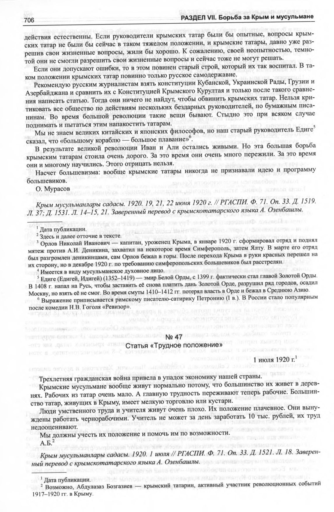 Статья «Трудное положение». 1 июля 1920 г. // РГАСПИ. Ф. 71. Oп. 33. Д. 1521. Л. 18. Заверенный перевод с крымскотатарского языка А. Озенбашлы.; Крым мусульманлары садасы. 1920. 1 июля.