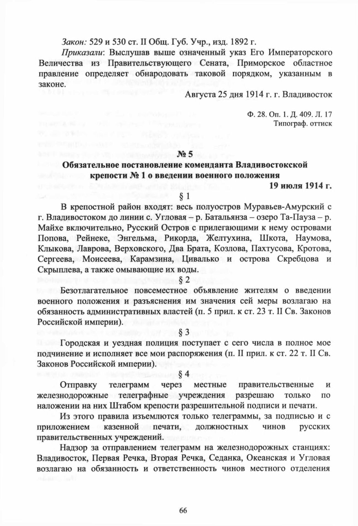 Обязательное постановление коменданта Владивостокской крепости № 1 о введении военного положения. 19 июля 1914 г. // РГИА ДВ. Ф. 28. Оп. 1. Д. 409. Л. 4-3об. Типограф. оттиск.