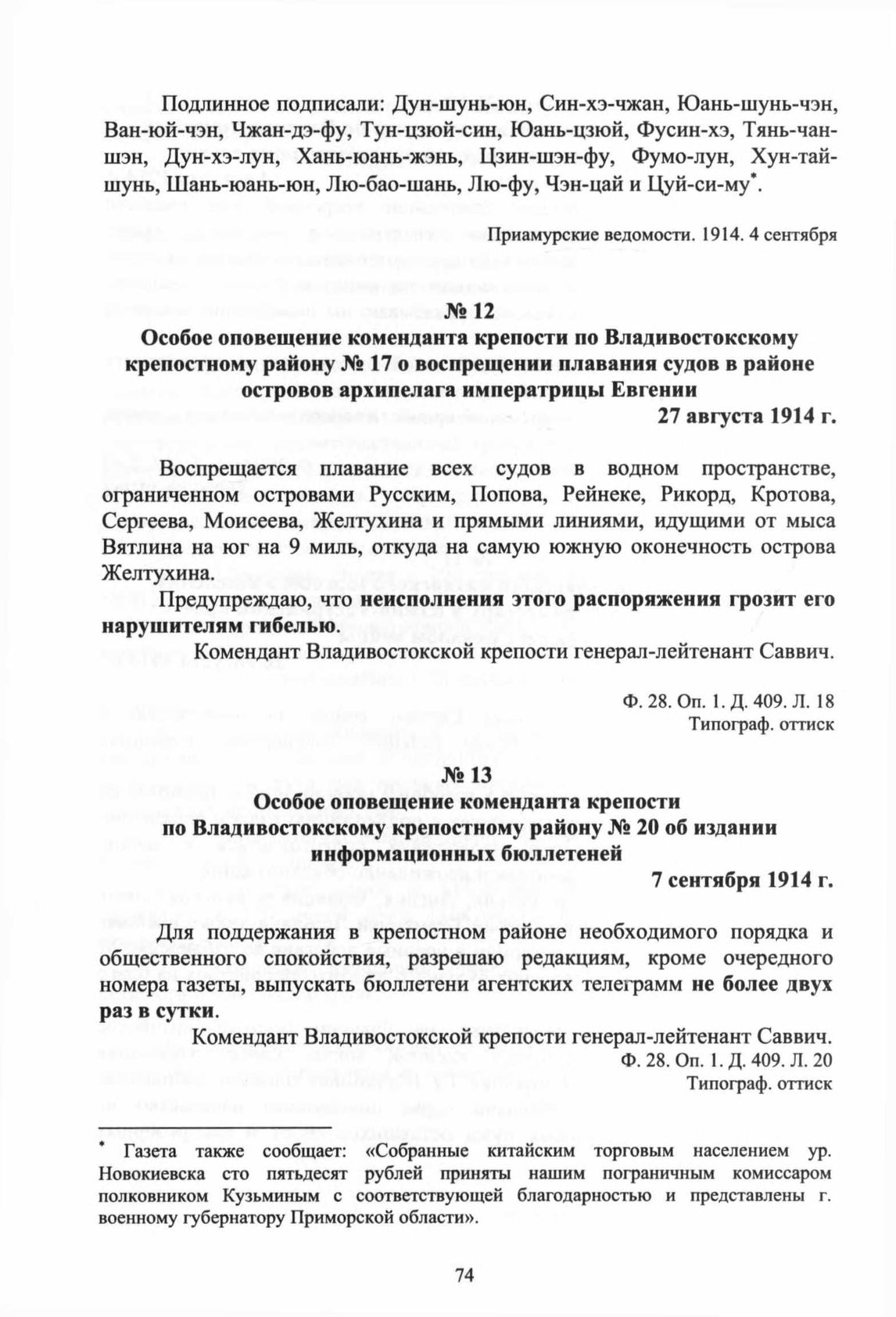 Особое оповещение коменданта крепости по Владивостокскому крепостному району № 20 об издании информационных бюллетеней. 7 сентября 1914 г. // РГИА ДВ. Ф. 28. Oп. 1. Д. 409. Л. 20. Типограф. оттиск.