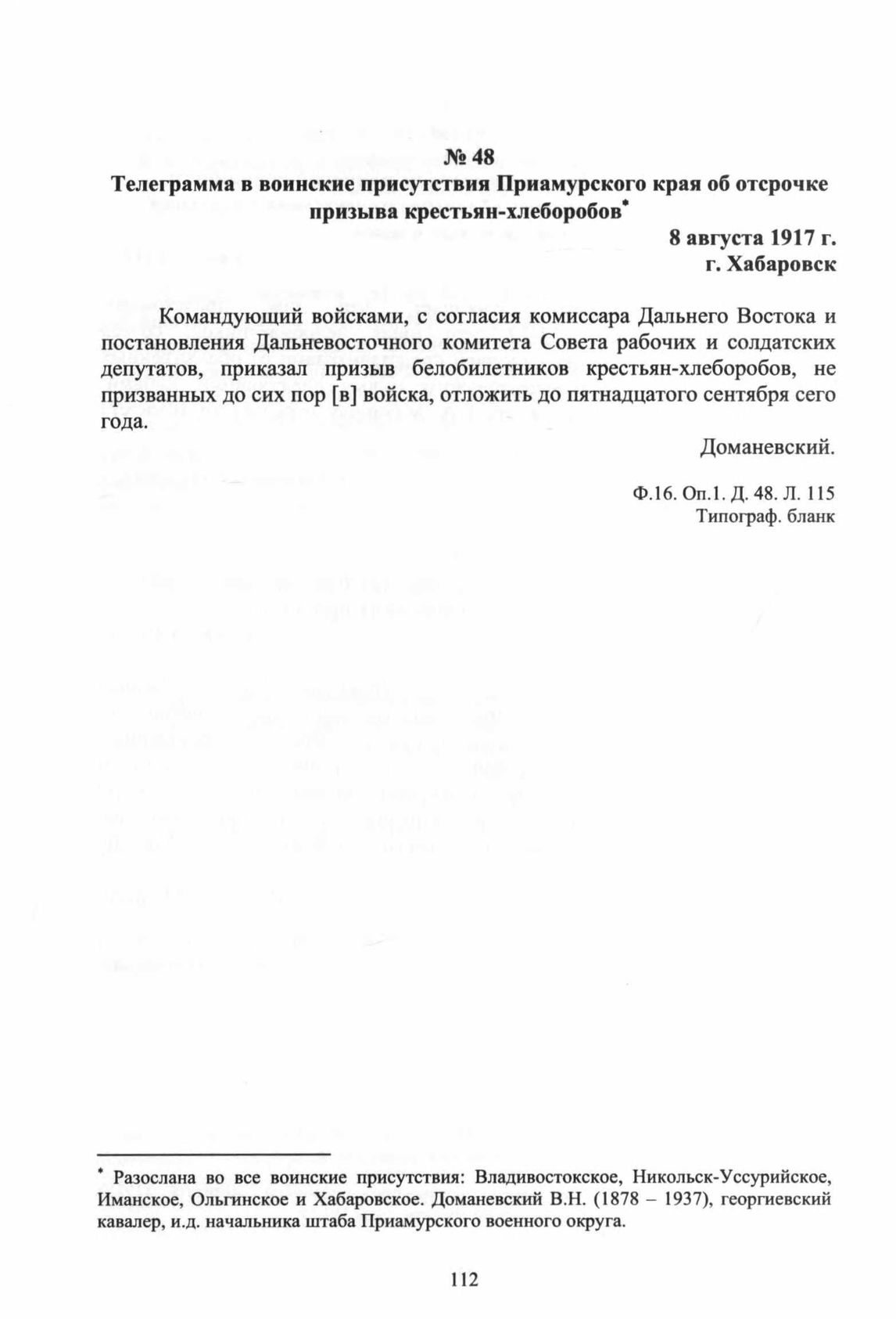Телеграмма в воинские присутствия Приамурского края об отсрочке призыва крестьян-хлеборобов. 8 августа 1917 г. г. Хабаровск // РГИА ДВ. Ф. 16. Оп. 1. Д. 48. Л. 115. Типограф. бланк.