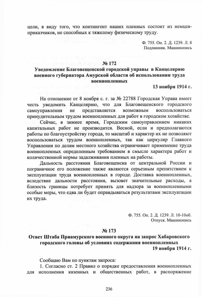 Уведомление Благовещенской городской управы в Канцелярию военного губернатора Амурской области об использовании труда военнопленных. 13 ноября 1914 г. // РГИА ДВ. Ф. 755. Оп. 2. Д. 1239. Л. 10-10об. Отпуск. Машинопись.