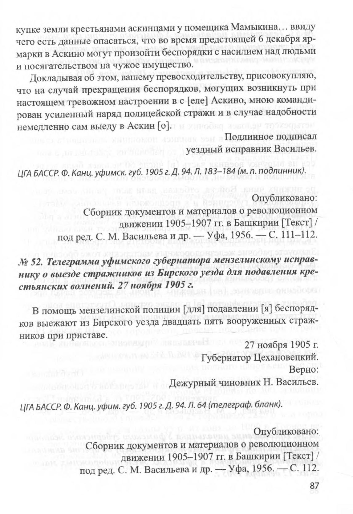 Телеграмма уфимского губернатора мензелинскому исправнику о выезде стражников из Бирского уезда для подавления крестьянских волнений. 27 ноября 1905 г. // ЦГА БАССР. Ф. Канц. уфим. губ. 1905 г. Д. 94. Л. 64 (телеграф, бланк).; Сборник документов и материалов о революционном движении 1905-1907 гг. в Башкирии [Текст] / под ред. С. М. Васильева и др. — Уфа, 1956. — С. 112.