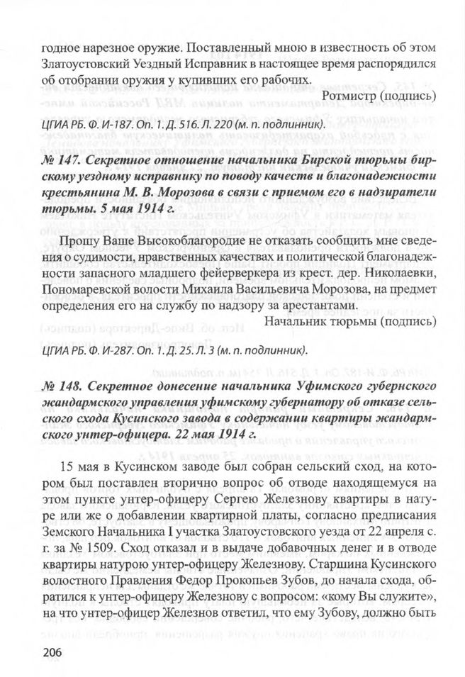 Секретное донесение начальника Уфимского губернского жандармского управления уфимскому губернатору об отказе сельского схода Кусинского завода в содержании квартиры жандармского унтер-офицера. 22 мая 1914 г. // ЦГИА РБ. Ф. И-187. Оп. 1.Д. 516. Л. 21 (м. п. копия, заверена).