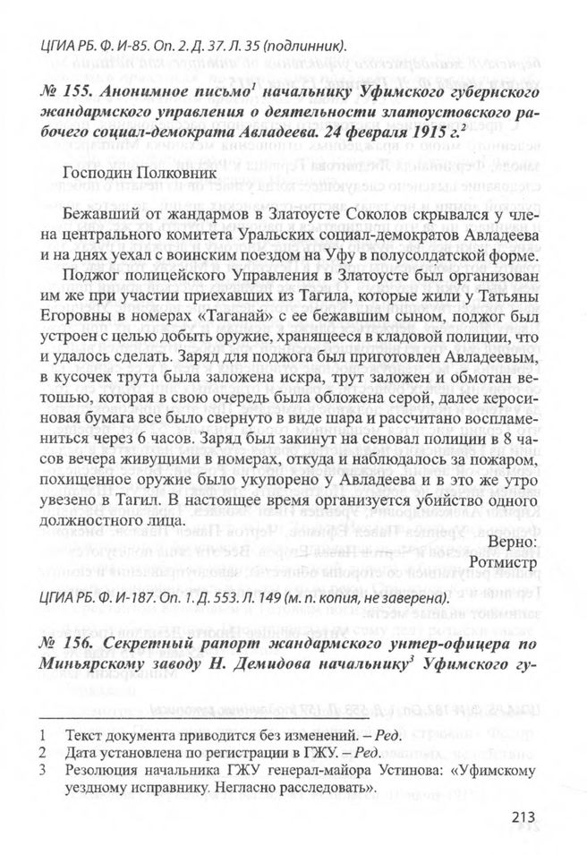 Секретный рапорт жандармского унтер-офицера по Мипьярскому заводу Н. Демидова начальнику Уфимского губернского жандармского управления об антирусской позиции механика завода Ф. Л. Герлица. 15 мая 1915 г. // ЦГИА РБ. Ф. И-187. Оп. 1. Д. 553. Л. 157 (подлинник, рукопись).