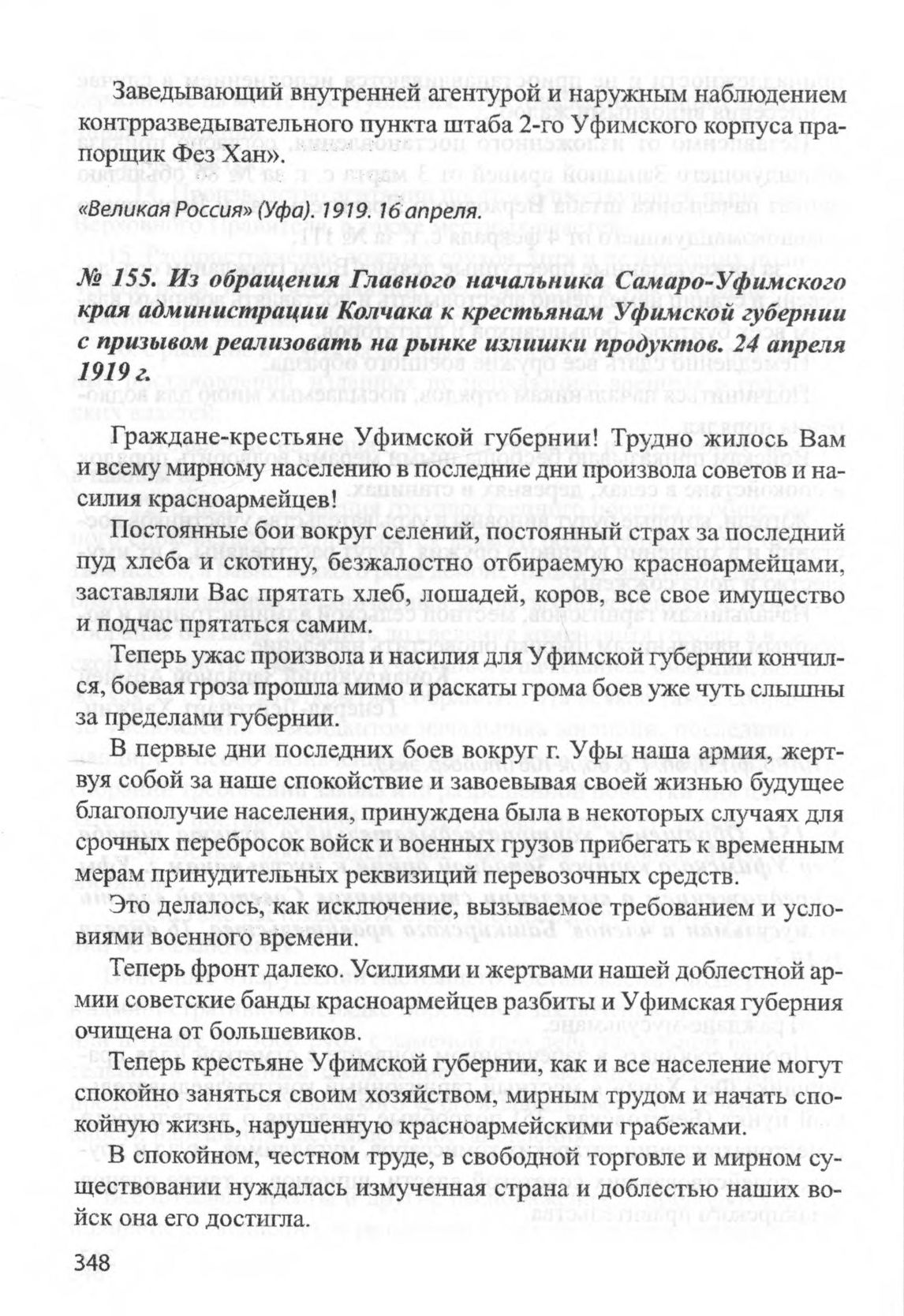 Из обращения Главного начальника Самаро-Уфимского края администрации Колчака к крестьянам Уфимской губернии с призывом реализовать на рынке излишки продуктов. 24 апреля 1919 г.
