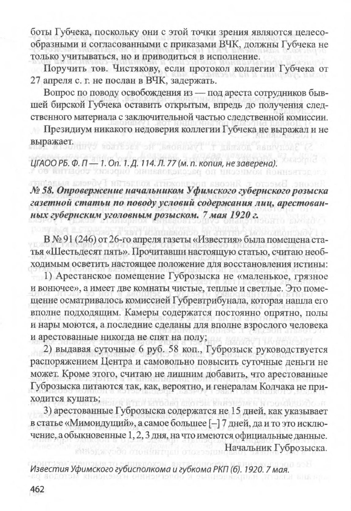 Опровержение начальником Уфимского губернского розыска газетной статьи по поводу условий содержания лиц, арестованных губернским уголовным розыском. 7 мая 1920 г. // Известия Уфимского губисполкома и губкома РКП(б). 1920. 7 мая.