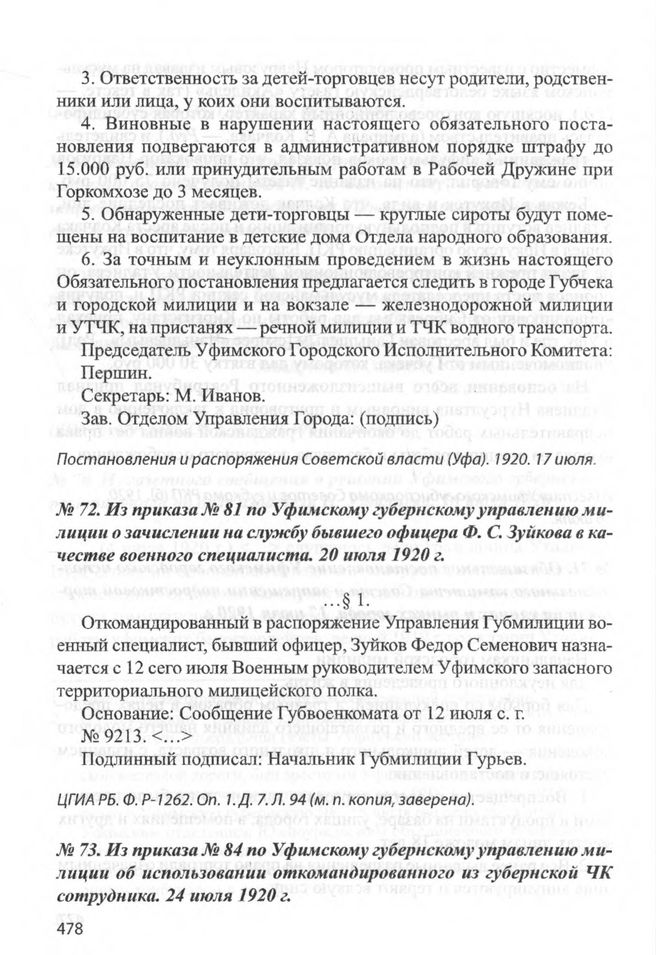 Из приказа № 81 по Уфимскому губернскому управлению милиции о зачислении на службу бывшего офицера Ф. С. Зуйкова в качестве военного специалиста. 20 июля 1920 г. // ЦГИА РБ. Ф. P-1262. Oп. 1. Д. 7. Л. 94 (м. п. копия, заверена).