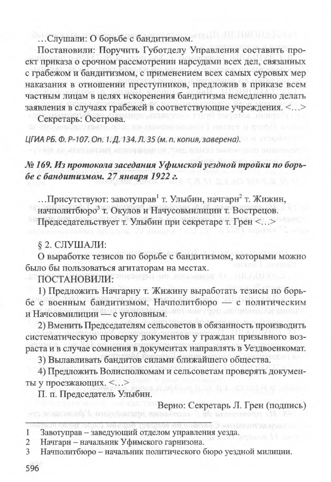 Из протокола заседания Уфимской уездной тройки по борьбе с бандитизмом. 27 января 1922 г. // ЦГИА РБ. Ф. Р-107. Oп. 1. Д. 134. Л. 53 (м. п. копия, заверена).