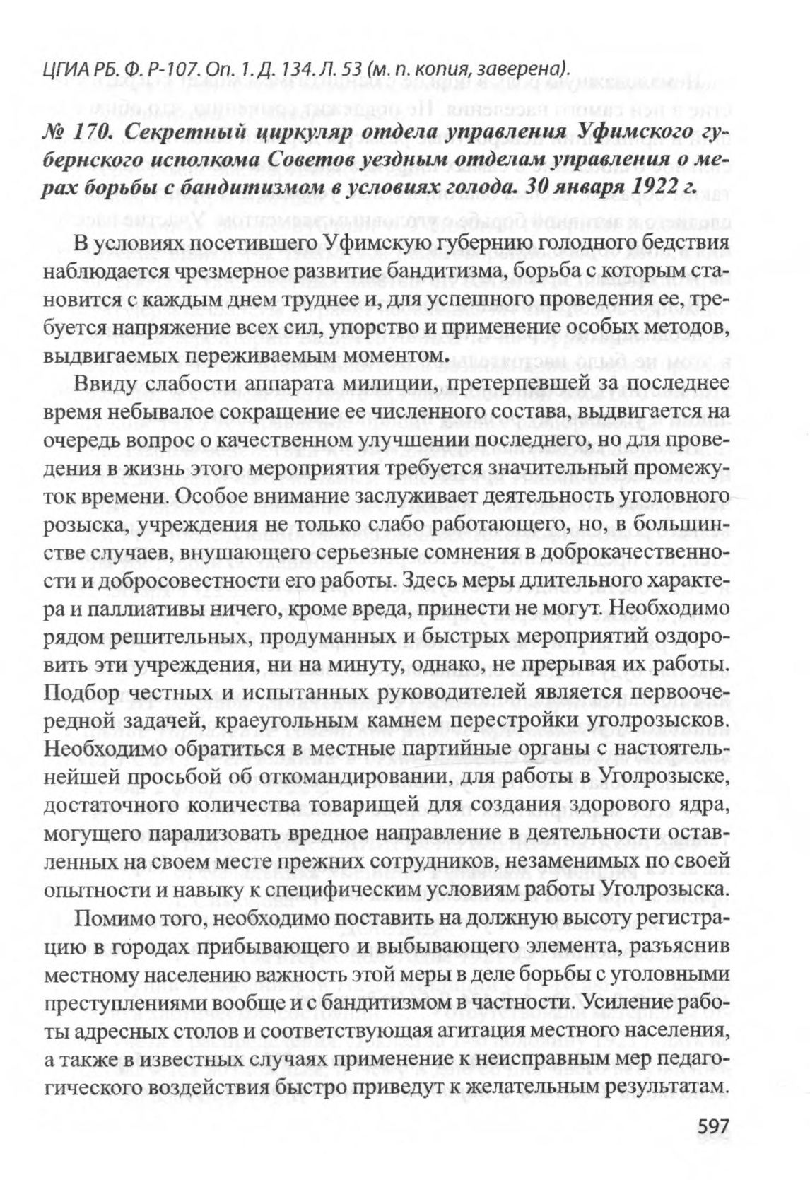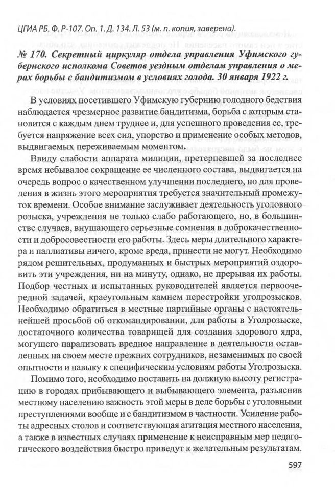 Секретный циркуляр отдела управления Уфимского губернского исполкома Советов уездным отделам управления о мерах борьбы с бандитизмом в условиях голода. 30 января 1922 г. // ЦГИА РБ. Ф. Р-107. Oп. 1. Д. 134. Л. 54 (подлинник).