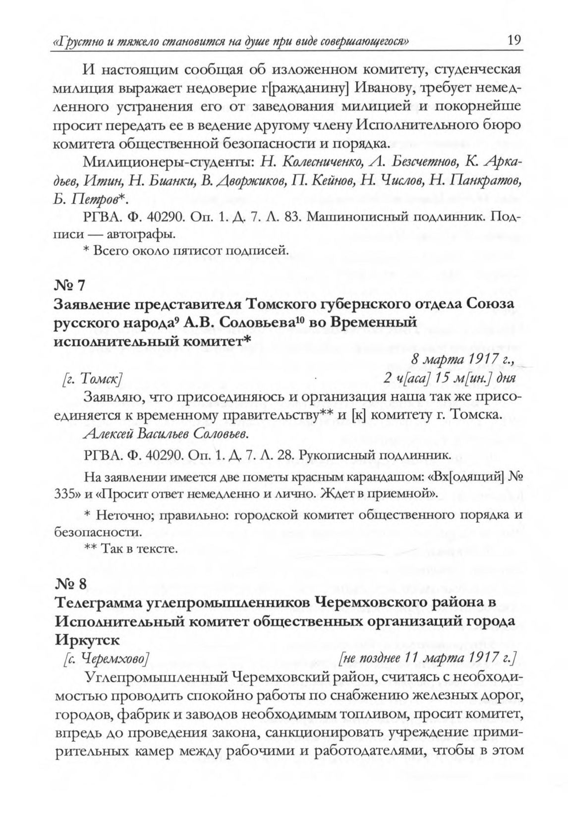 Заявление представителя Томского губернского отдела Союза русского народа А.В. Соловьева во Временный исполнительный комитет. 8 марта 1917 г. [г. Томск] // РГВА. Ф. 40290. Oп. 1. Д. 7. Л. 28. Рукописный подлинник.