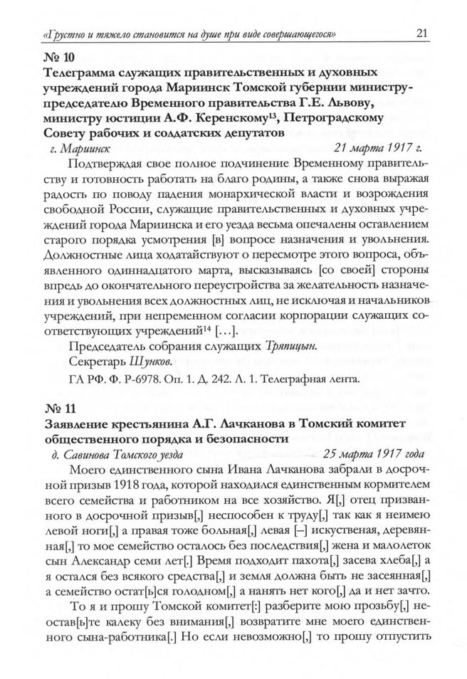 Телеграмма служащих правительственных и духовных учреждений города Мариинск Томской губернии министру- председателю Временного правительства Г.Е. Львову, министру юстиции А.Ф. Керенскому, Петроградскому Совету рабочих и солдатских депутатов. г. Мариинск. 21 марта 1917 г.