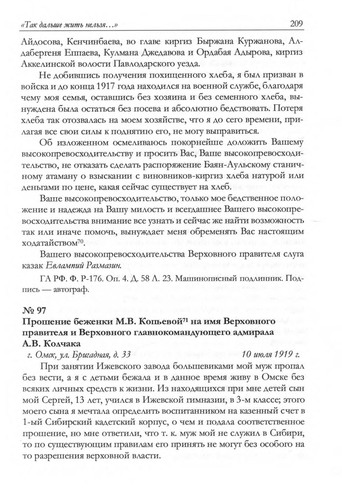 Прошение беженки М.В. Копьевой на имя Верховного правителя и Верховного главнокомандующего адмирала А.В. Колчака. г. Омск, ул. Бригадная, д. 33. 10 июля 1919 г. // ГА РФ. Ф. Р-176. Оп. 4. Д. 62. Л. 252. Машинописный подлинник. Подпись — автограф.