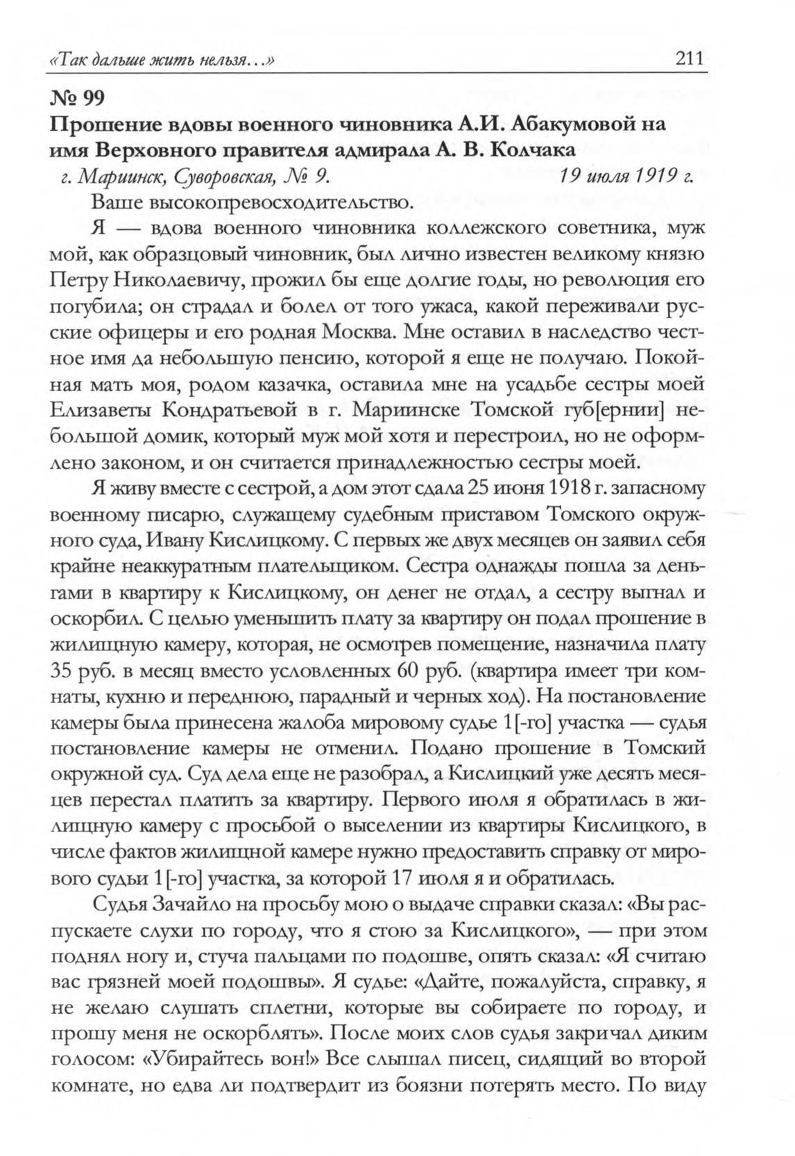 Прошение вдовы военного чиновника А.И. Абакумовой на имя Верховного правителя адмирала А. В. Колчака. г. Мариинск, Суворовская, № 9. 19 июля 1919 г. // ГА РФ. Ф. Р-176. Оп. 4. Д. 44. Лл. 40-41. Рукописный подлинник.