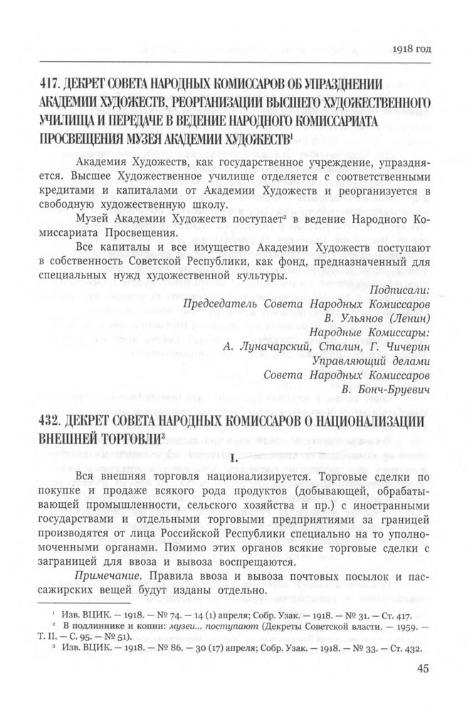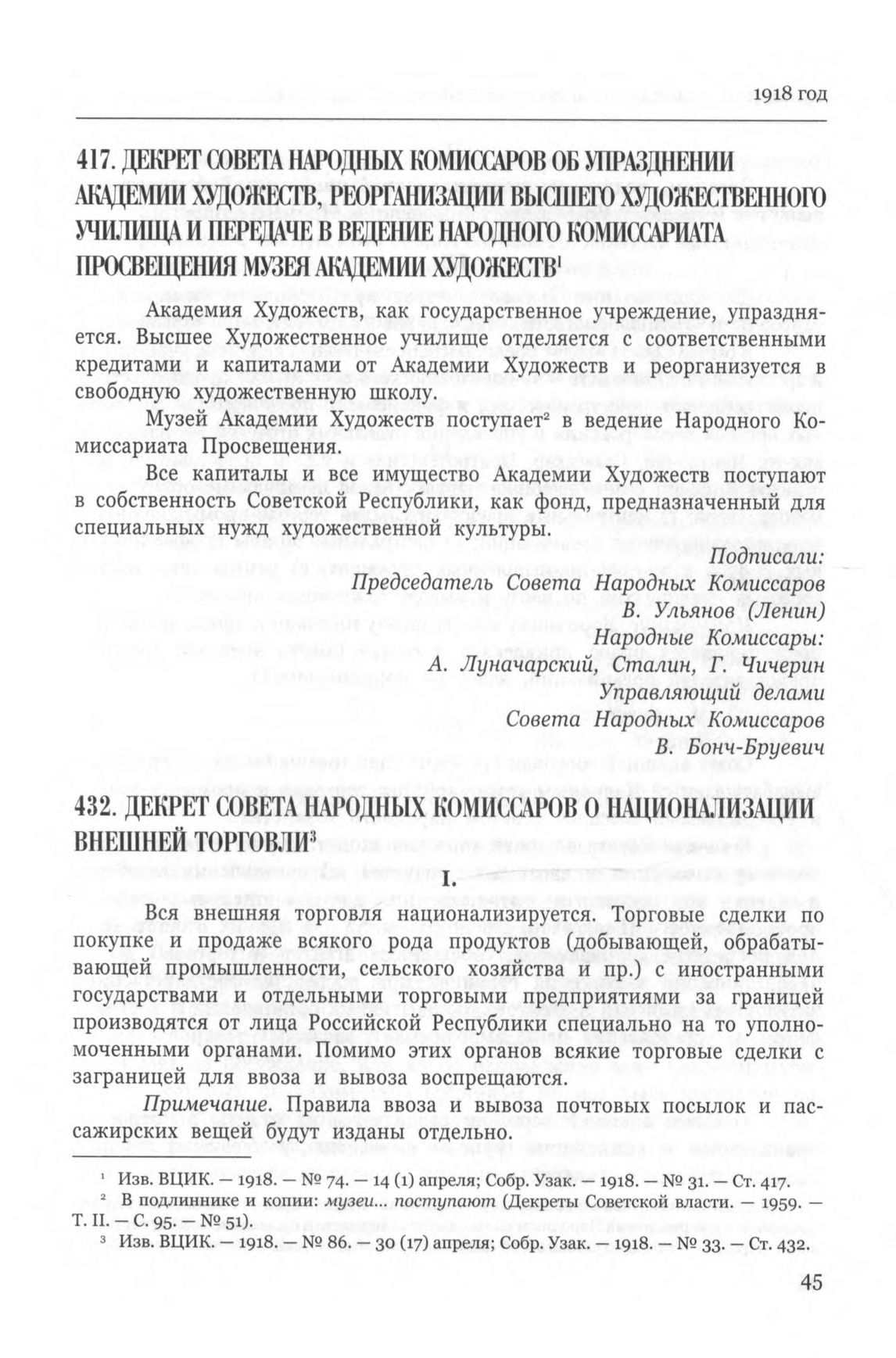 Декрет Совета Народных Комиссаров о национализации внешней торговли. Москва, 22 апреля 1918 г. // Изв. ВЦИК. — 1918. — № 86. — 30 (17) апреля; Собр. Узак. — 1918. — № 33. — Ст. 432.