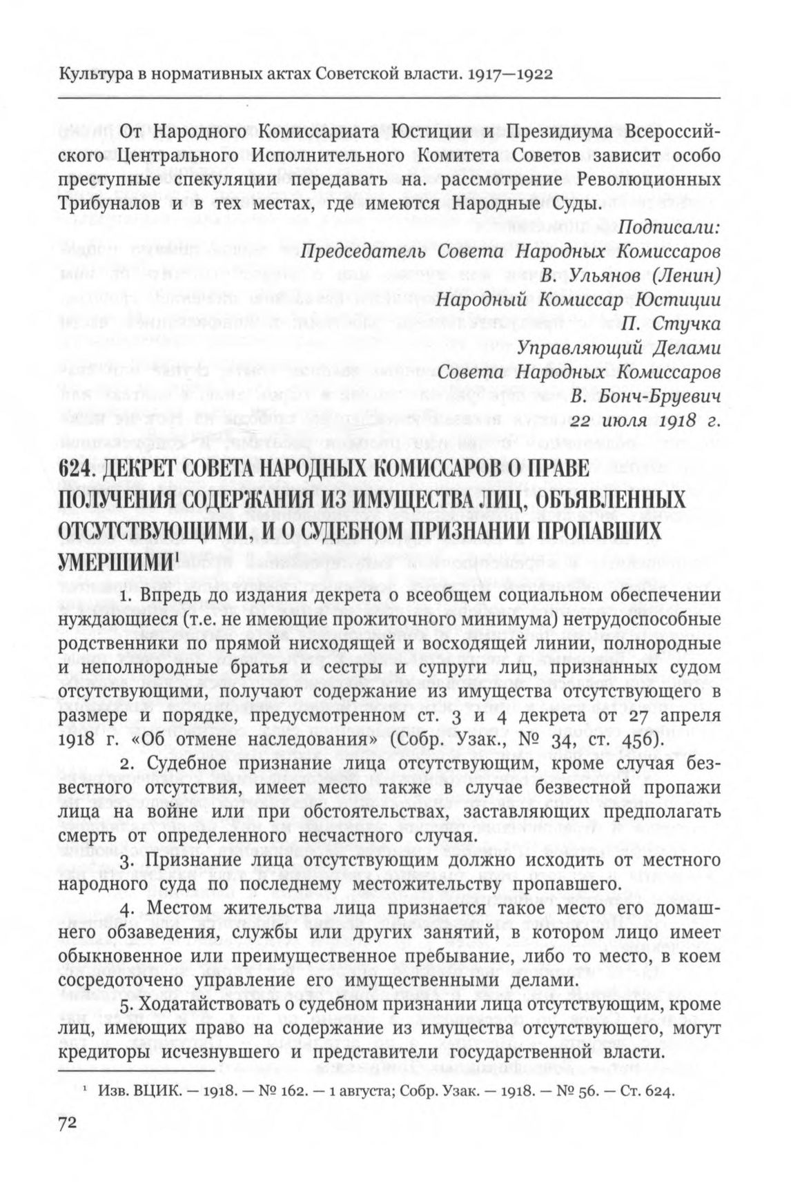 Декрет Совета Народных Комиссаров о праве получения содержания из имущества лиц, объявленных отсутствующими, и о судебном признании пропавших умершими. 17 июня 1918 г. // Изв. ВЦИК. — 1918. — № 162. — 1 августа; Собр. Узак. — 1918. — № 56. — Ст. 624.